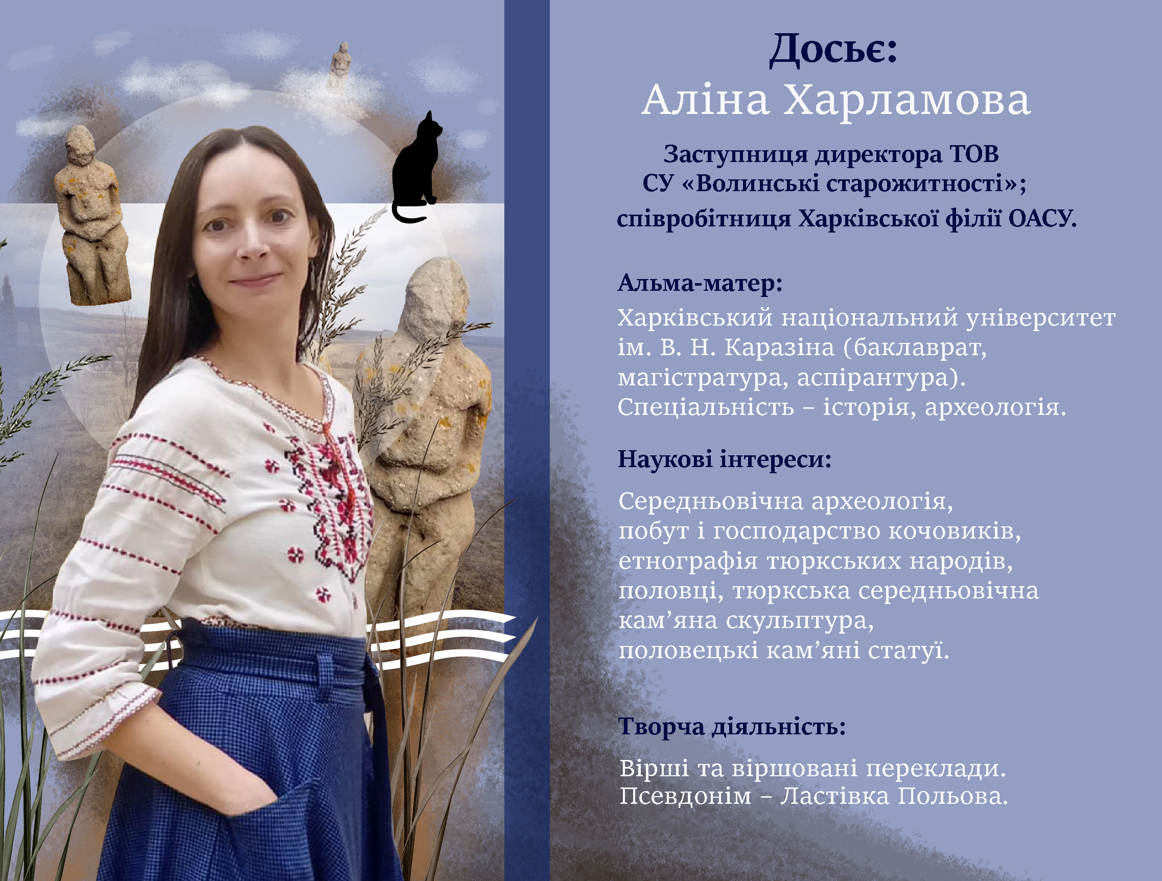 Насправді археологиня Аліна Харламова має широкі наукові інтереси, зокрема, одна з ваших провідних тем – це дослідження кам’яних баб. Звідки прийшов цей інтерес, чому обрали саме цю тему? А як щодо полтавських представниць цього кам’яного «війська», досліджували, описували?