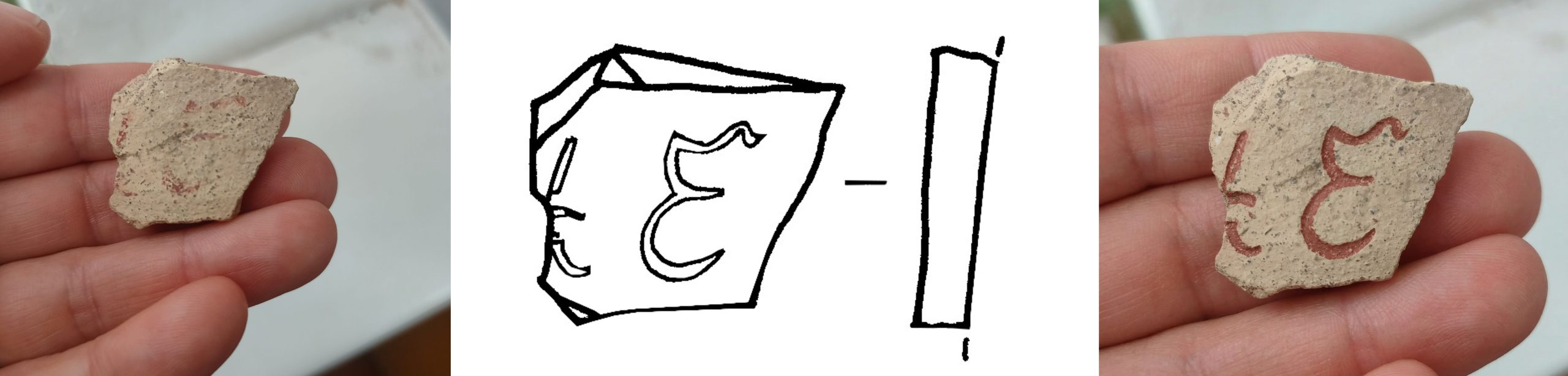 Наша знахідка – фрагмент стінки амфори з червоно-коричневим діпінті. Вона має одну доволі чітку літеру, найімовірніше Епсилон, та іншу, яка збережена частково, що ускладнює її прочитання та інтерпретацію всього напису загалом. А знайдена ця підписна стіночка була у 2014 році, під час розвідок, В’ячеславом Шерстюком на селищі черняхівської культури в ур. Хозари, село Кантемирівка на Чутівщині, відомому ще за дослідженнями Михайла Рудинського та Євгенії Махно.