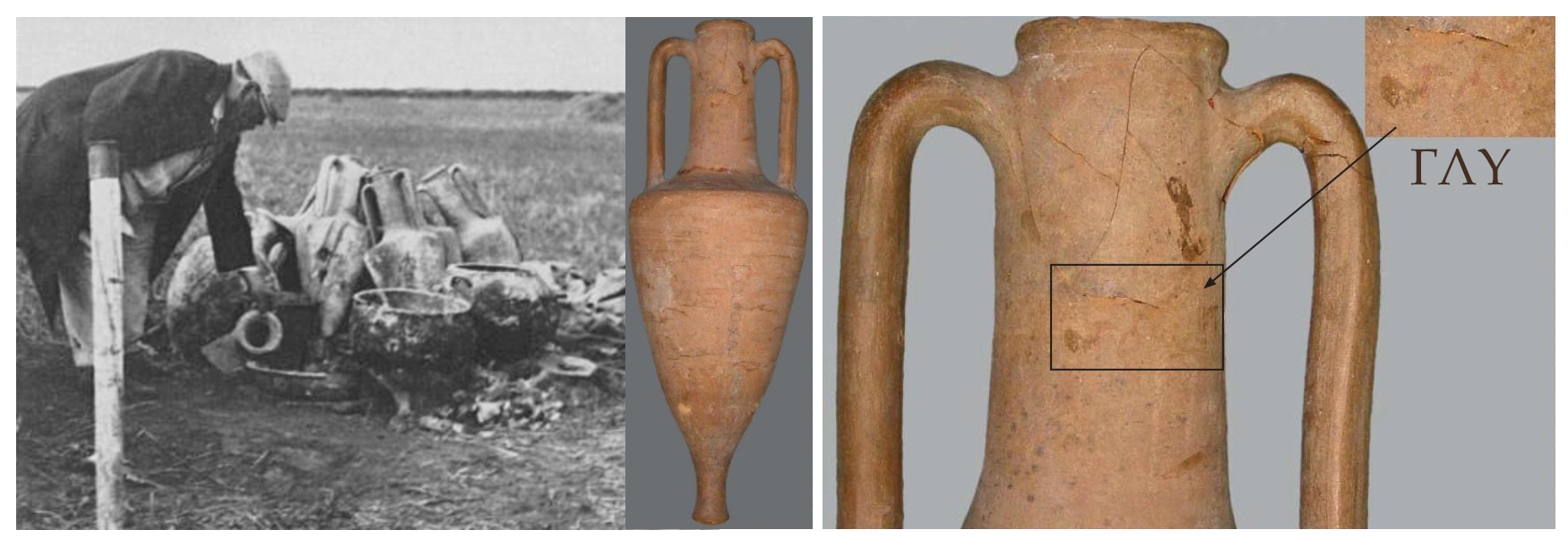 1) Амфори. На рокопках кургану Солоха. 1912 -1913 р.р.; 2) Напис-діпінті на одній із амфор. Джерело: museum.kh.ua